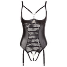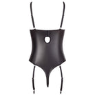 Sensual string body with adjustable and detachable suspender straps and a lightly padded shelf bra with a hook fastener at the back. With delicate strap details and elaborate rhinestones in the cleavage area.