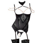 The two adjustable cleavage straps are fancy because they go from the adjustable bra straps to the choker. The choker has a hook and loop fastener. The chains over the breasts and shoulders are decorated with rhinestones and have snap hooks which means that they are removable. The small crotchless string made out of stretchy satin and a removable chain over the crotch is included.