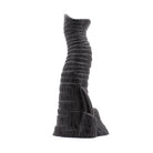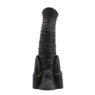 The shape represents an elephant trunk with its tusks. The upper part is flat and the surface of the dildo is ribbed. It has a suction cup base.