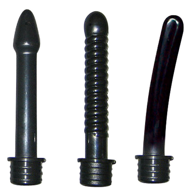 Black intimate shower with three different attachments. One attachment slightly curved, the others arrow shaped and twisted. Each one with two openings and with a length of 4.5 inches. The capacity of the intimate shower is 100 ml. Material: ABS, rubber.