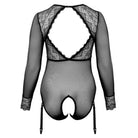 Black-transparent, crotchless and long-sleeved body from Cottelli CURVES made of fine powernet with inserts in delicate lace. Extremely stretchy and soft to the touch for a close fit and maximum comfort. Large cut-out at the back, clip fastening at the back of the neck. Featuring a crotchless design up to above the bottom. The two suspenders at the front are adjustable and also completely detachable.