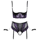 Longline, quarter cup bra, crotchless suspender briefs and 2 wrist cuffs combined in a set from Cottelli BONDAGE. Bra and briefs made of purple soft floral lace with details in a noble black matte look. Suspender briefs with additional powernet inserts. The quarter-cup bra with lightly padded underwire cups brings the bust into top form and directly into the field of vision. The straps and hook fastening at the back are adjustable. The waist-high suspender briefs seduce with decorative lacing at the front and a completely open crotch with a stimulating chain (removable). The suspender straps can be adjusted to fit and are also completely removable. At the sides of the waistband, there is a ring to which the two included soft wrist cuffs can be hooked with their snap hook chains. Cuffs with adjustable hook-and-loop fasteners.
