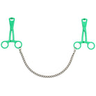 Green plastic scissor nipple clamps joined by 14 inch metal chain.