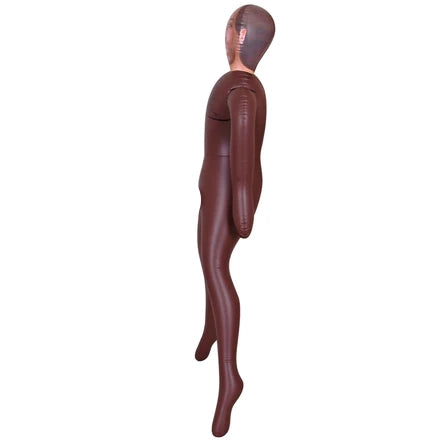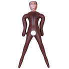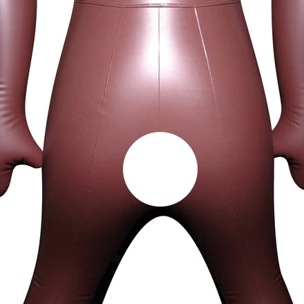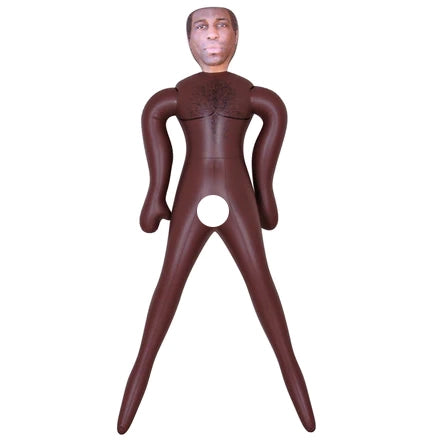 Black, male love doll with a firm penis, printed face, dark hair and printed chest hair. His mouth is closed, but he has a nice and tight anus. Inflatable to life-size.