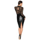 Knee-length long-sleeved dress in a tight tailored cut in a noble black mix of soft lace, top, and matt-shiny power wet look, skirt part. Small stand-up collar to close with 2 buttons at the back. Small slit in the back hem.