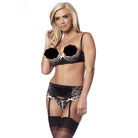 Amorable by Rimba, open bra, suspender belt and g-string with adjustable straps and hook and eye fastening.
