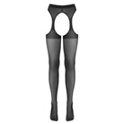Black suspender stockings from Cottelli LEGWARE with a decorative seam at the back of the leg. Reinforced panty part with an open crotch and cut-outs at the sides. All openings are edged with fine lace trim. Preformed feet. Yarn weight 20 den. Oeko-Tex certified.